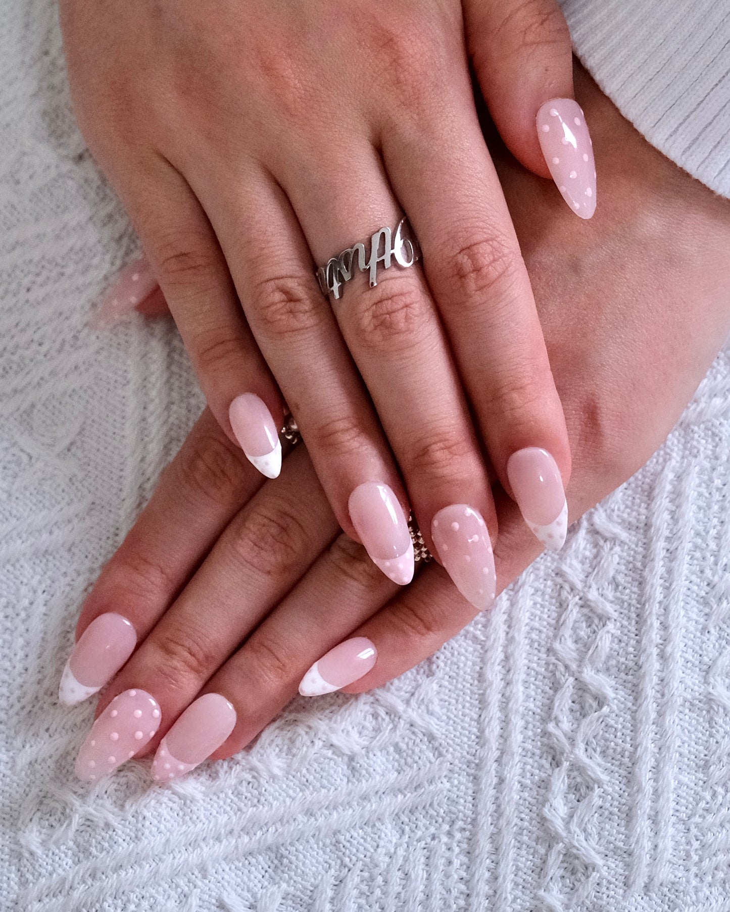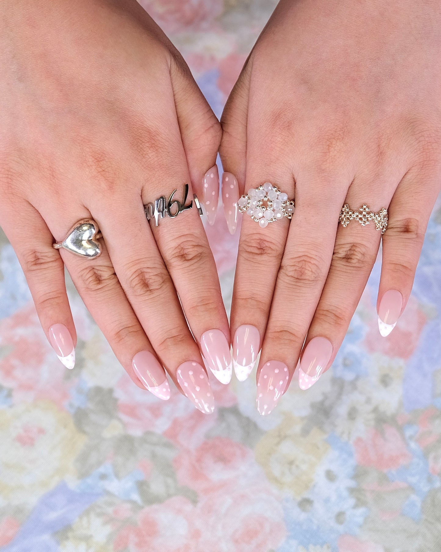 Regular price $25.50“Pink Dots” is a handmade press-on nail set featuring soft blush tones with delicate pink polka dots and French tips.