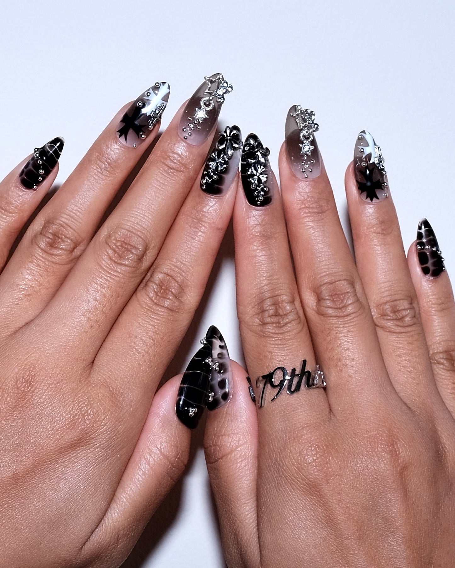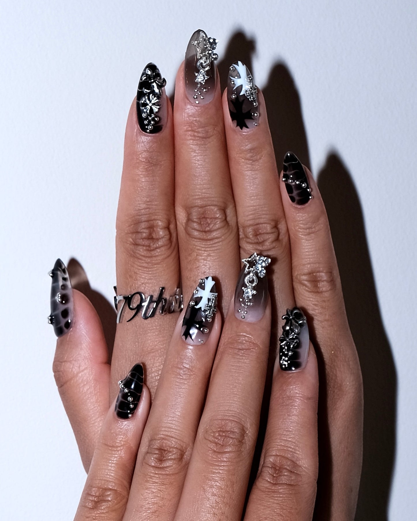 “Chrome Star” features smoky black tones, embellished with silver chrome stars, cross charms, and star accents – meticulously crafted for a bold, edgy, and luxurious finish.