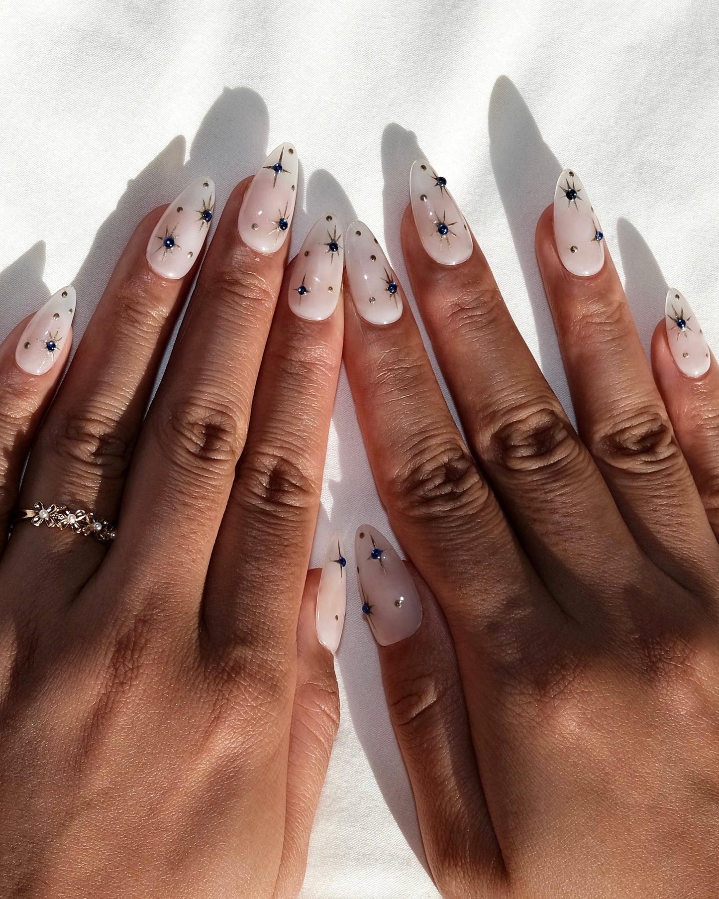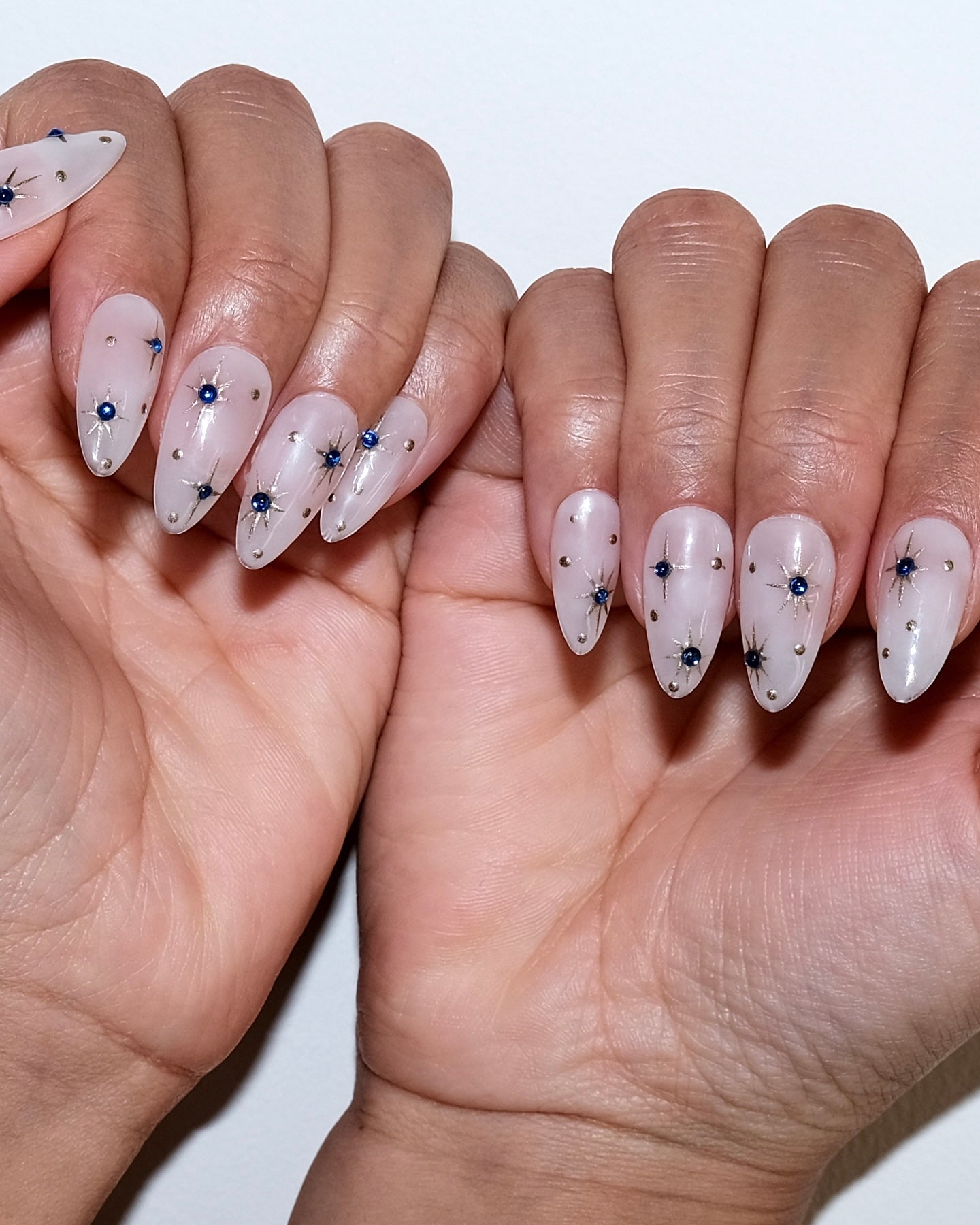 “Starlight” is a handmade press-on nail set in crisp white, adorned with golden starbursts and sapphire-blue crystals for an elegant, celestial look.