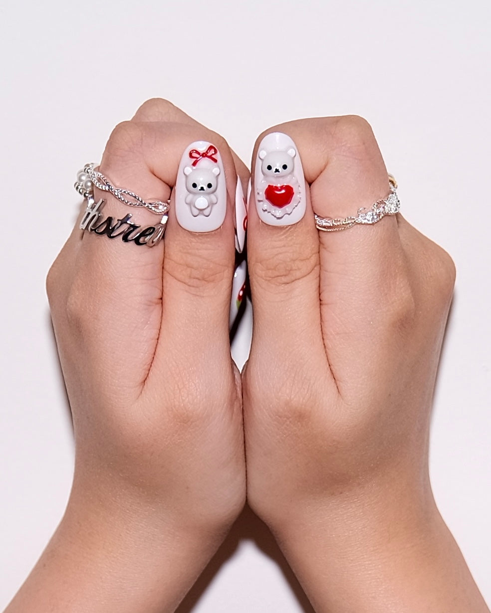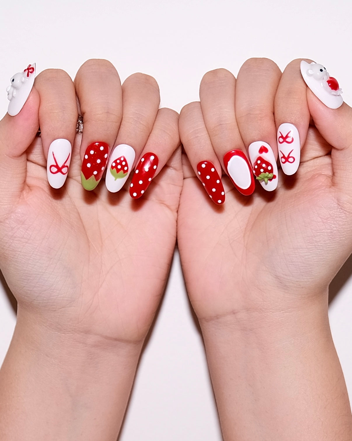 Regular price $30.60“Strawberry Teddy” is a playful yet romantic press-on nail set featuring creamy nude bases, bright strawberry red accents, and adorable teddy bear charms. Polka dots, glossy red bows, and sweet strawberry details create a juicy, kawaii-inspired look that feels cute, cozy, and irresistibly charming.
