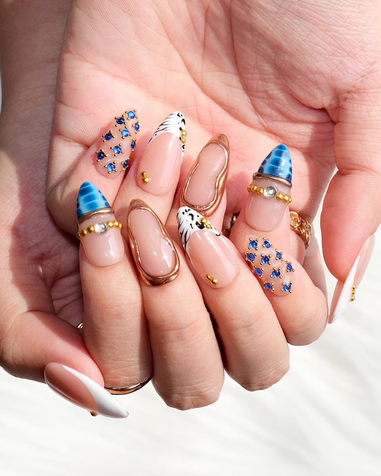 Regular price $29.75“Blue Crystal” is a luxurious press-on nail set featuring elegant gold accents, deep blue crystal details, and a stunning combination of sleek, polished surfaces and bold patterns. The set includes geometric designs, delicate jewels, and sophisticated textures, making it the perfect choice for a bold, high-fashion statement.
