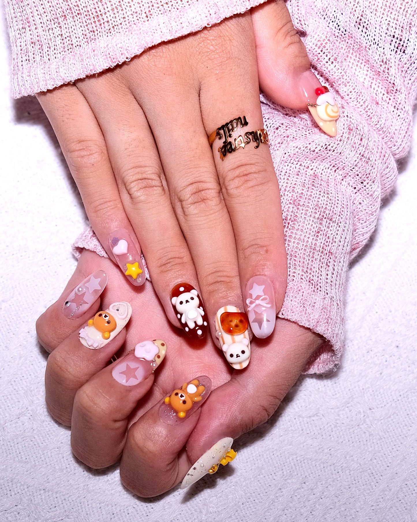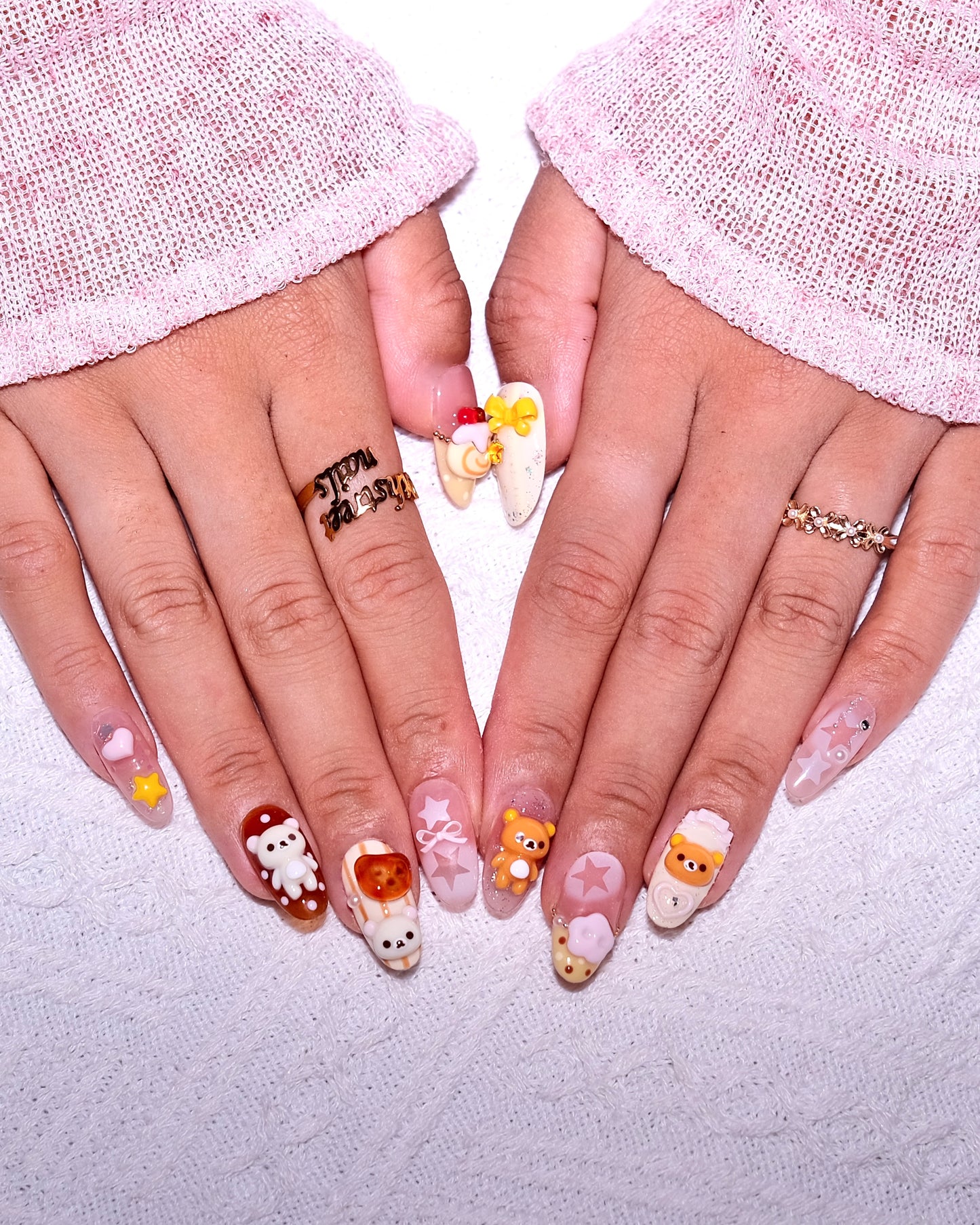 “Caramel Bear” is a handmade press-on nail set featuring warm caramel tones, 3D bear charms, star accents, and whipped cream details — perfect for a sweet, cozy, café-inspired look.
