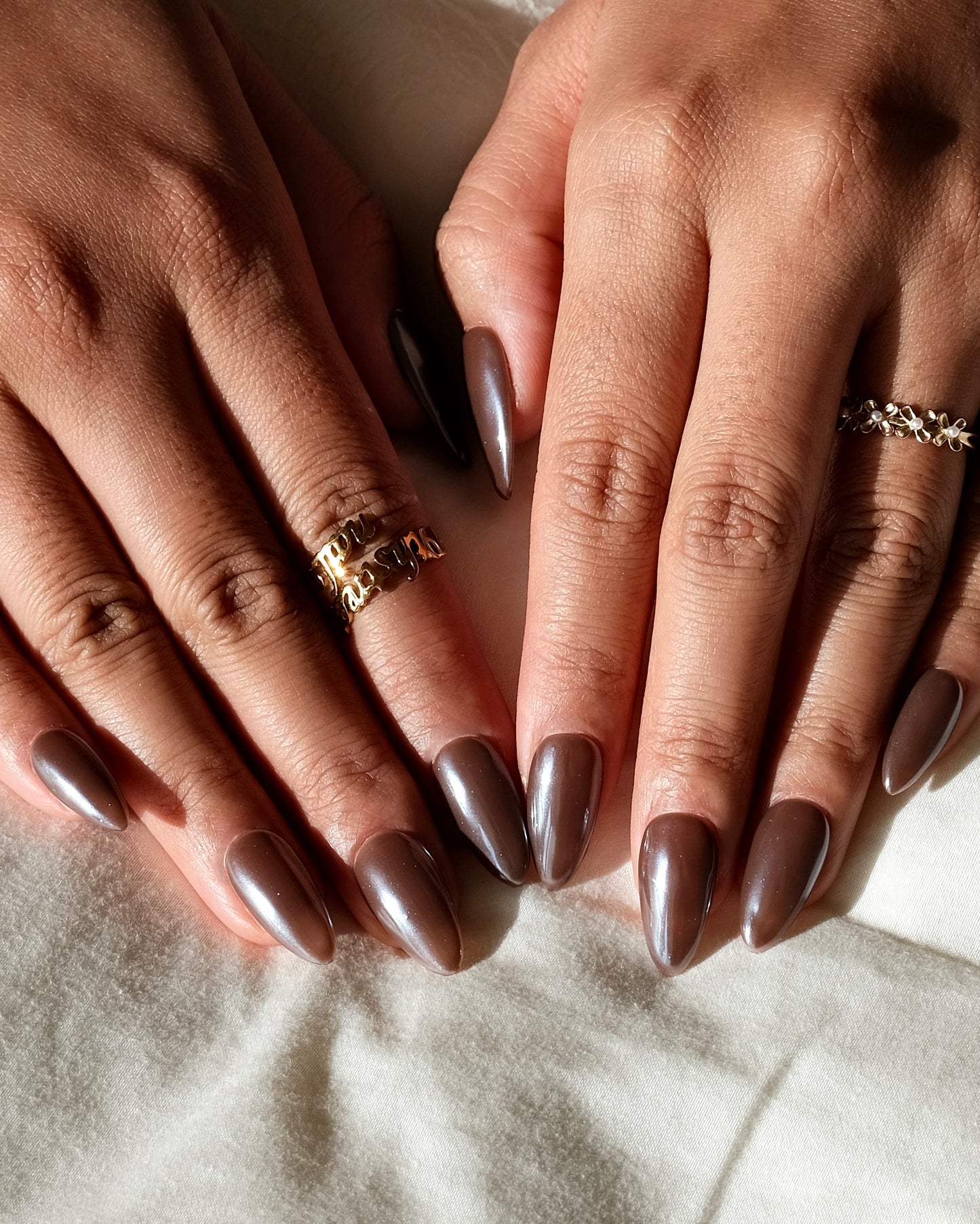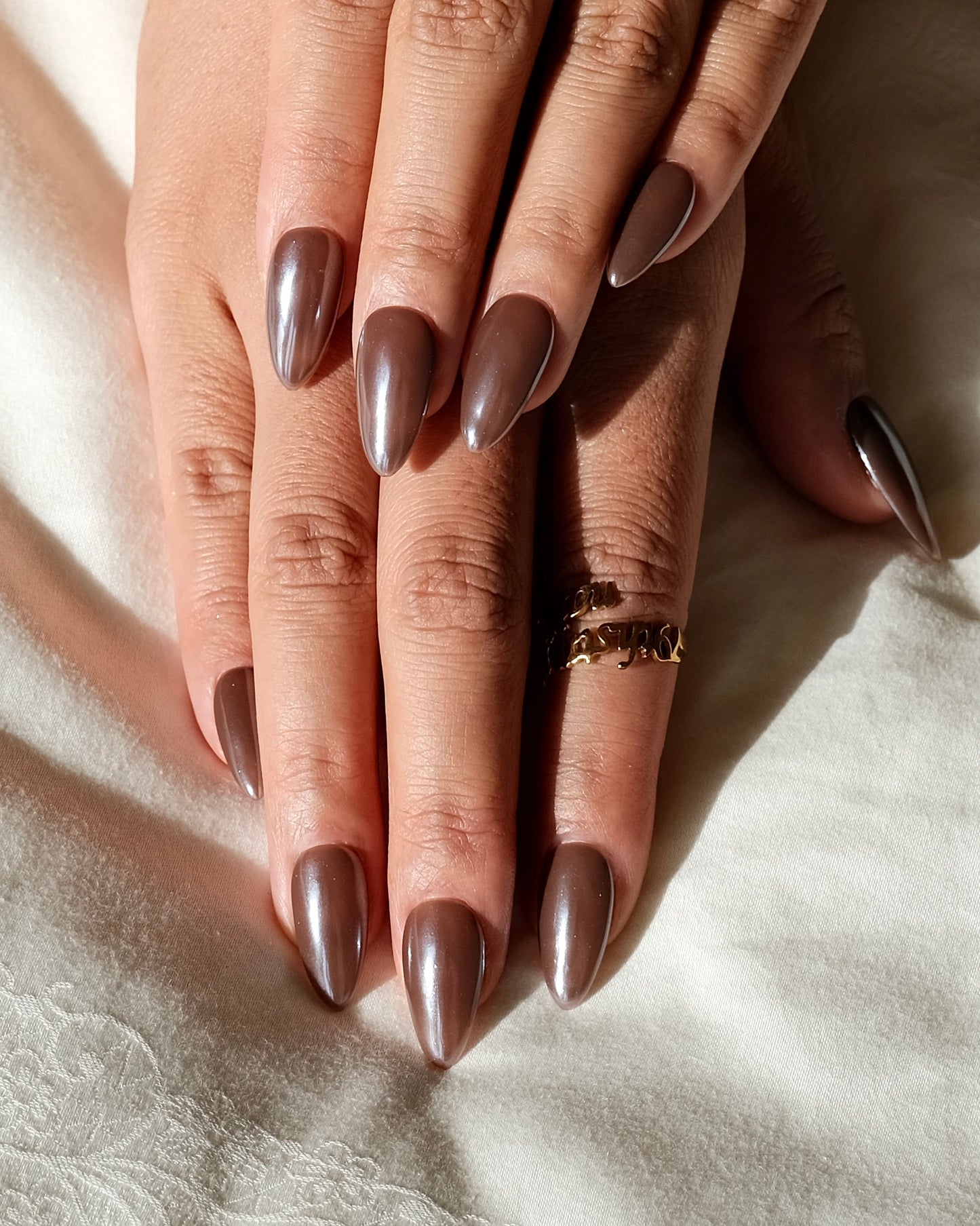 "Cocoa" features a glossy metallic brown finish with a mirror-like sheen.