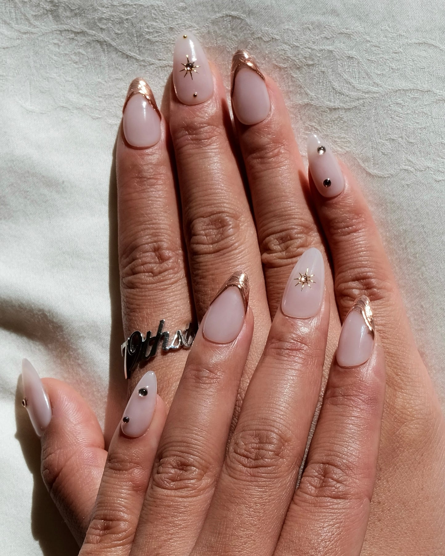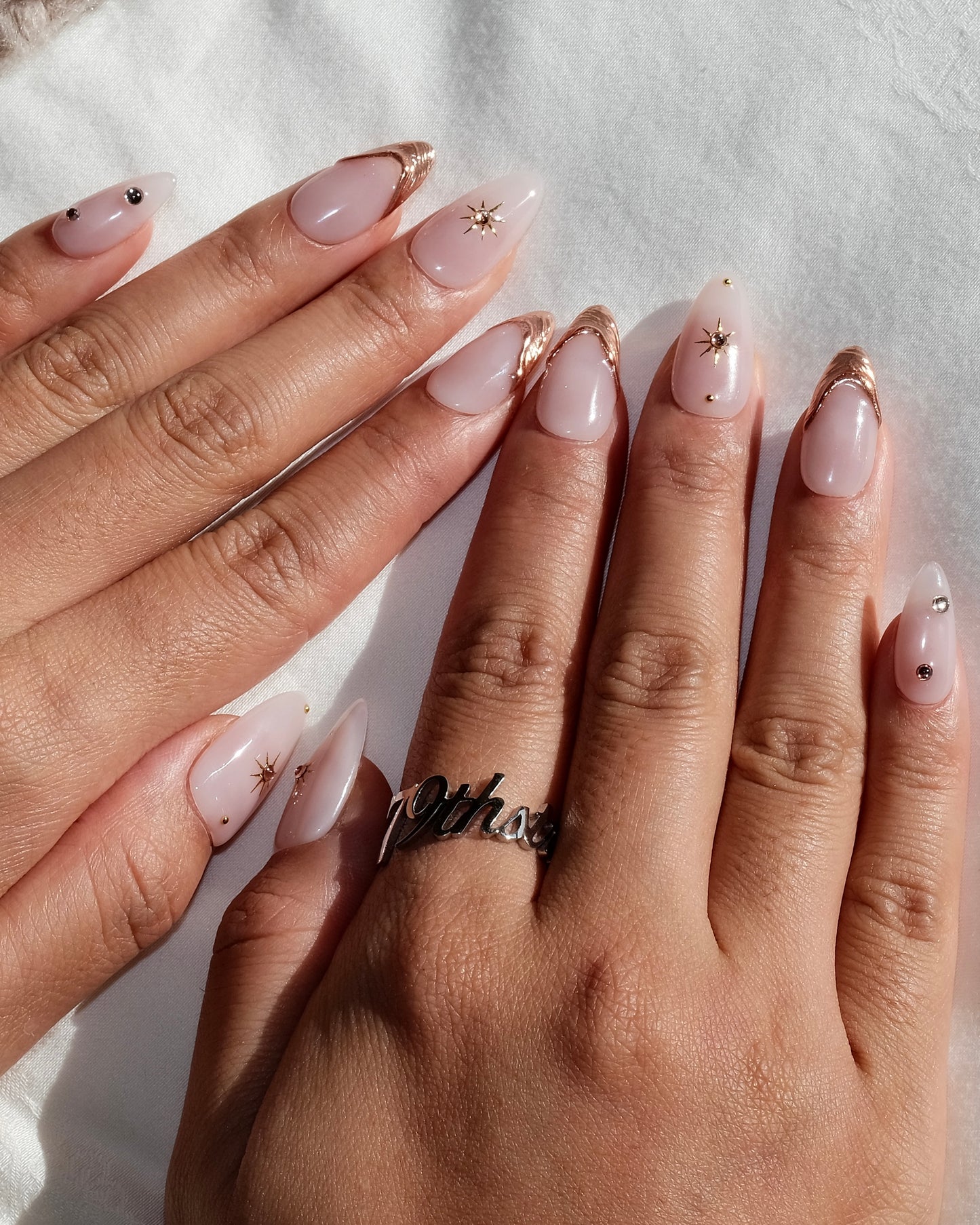 “Golden Dawn” is a handmade press-on nail set featuring nude blush tones with rose-gold chrome accents, starburst charms, and crystal embellishments.