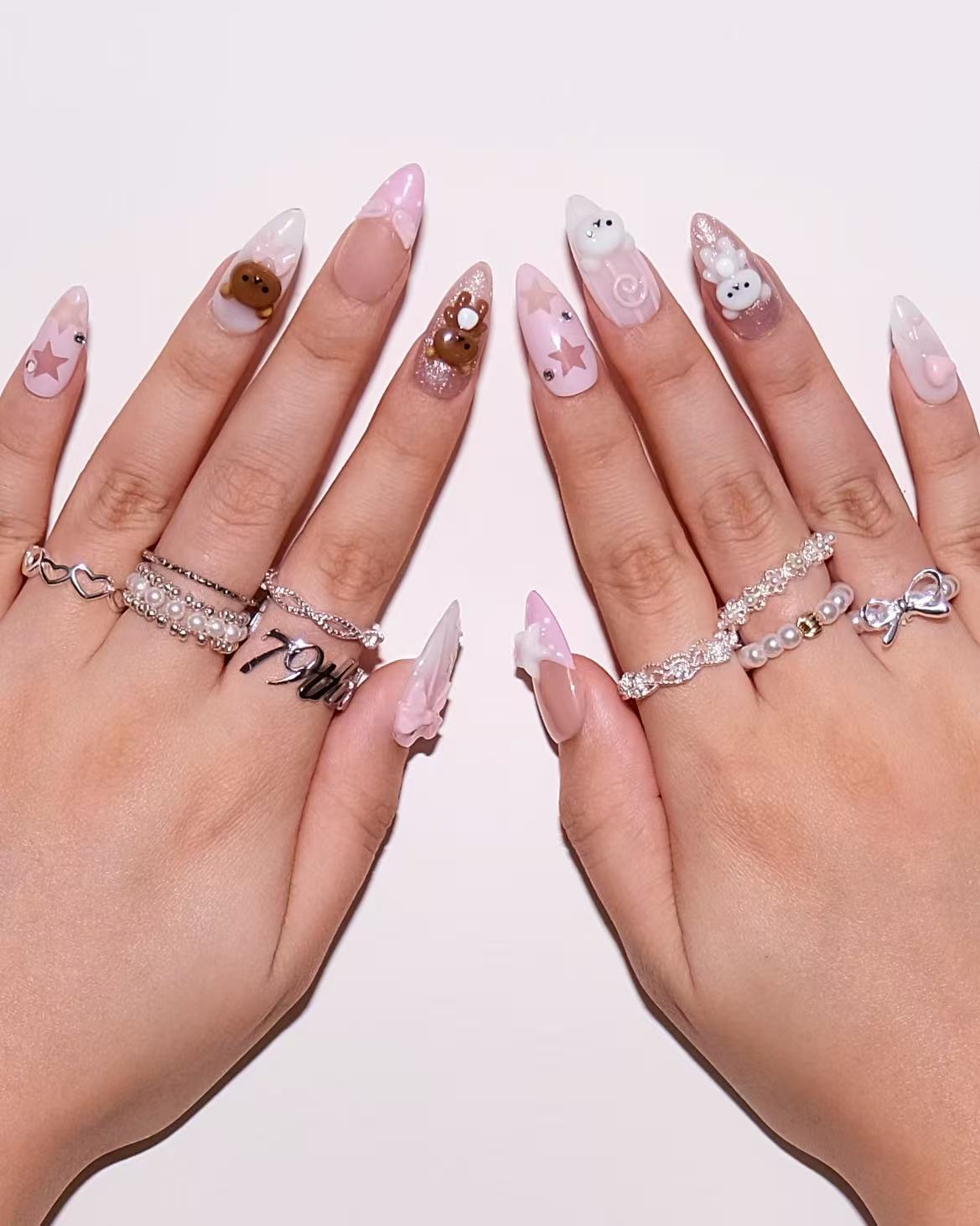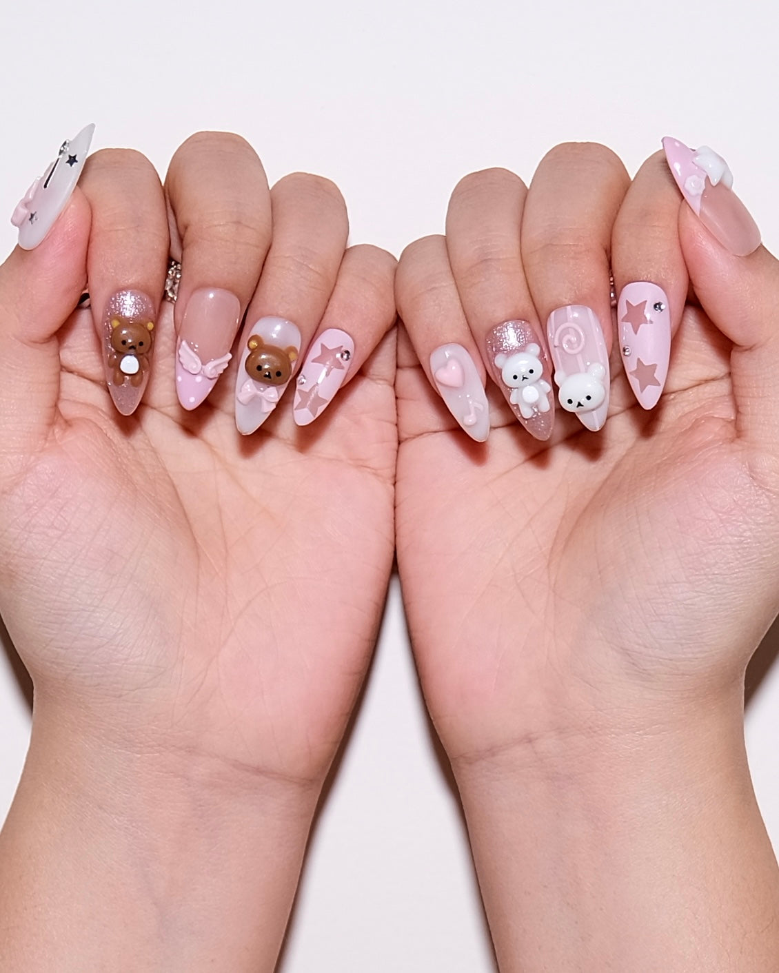 Regular price $30.60“Pink Teddy Dream” is a soft, dreamy press-on nail set featuring blush pink gradients, sparkly rose tones, and adorable teddy bear charms. Delicate stars, bows, pearls, and glossy details create a sweet, cozy aesthetic that feels playful yet romantic—like a pastel teddy dream come to life.