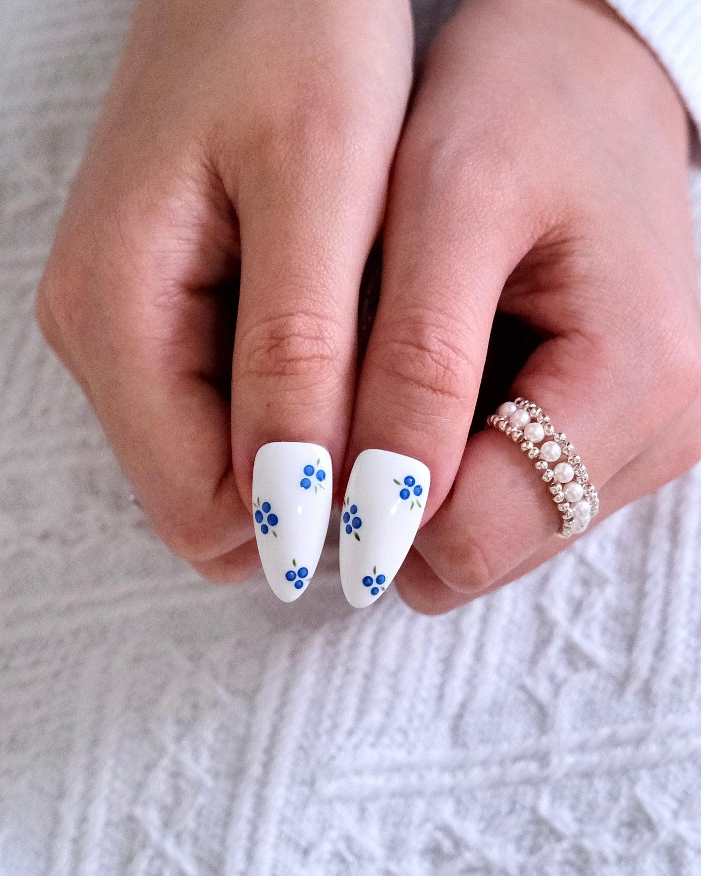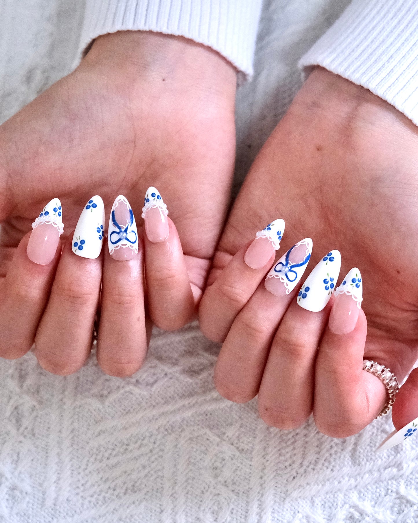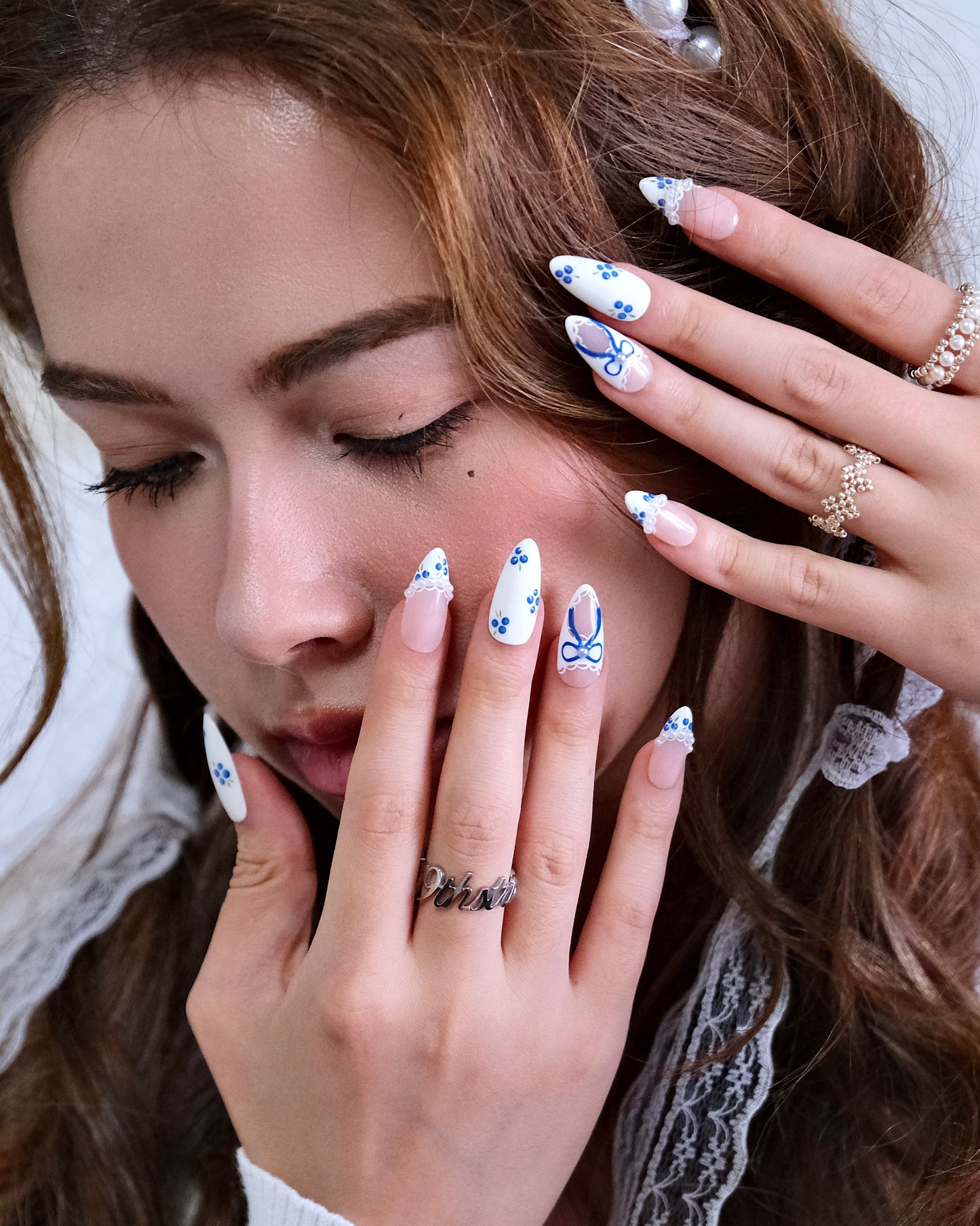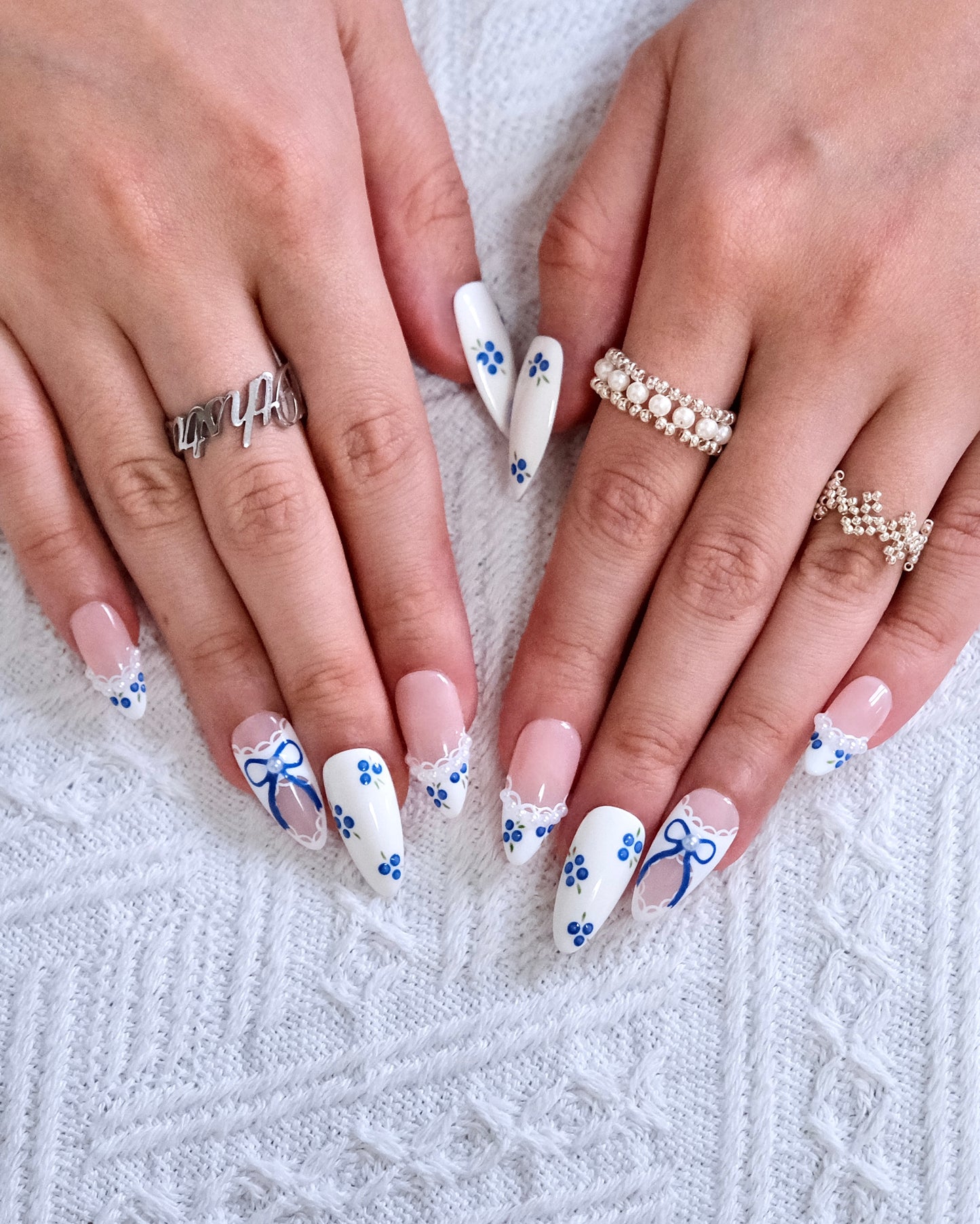“Blueberry Lace” is a handmade press-on nail set featuring delicate blue floral accents, white lace-inspired details, and dainty pearl trims — a sweet and elegant design perfect for spring and soft, romantic looks.