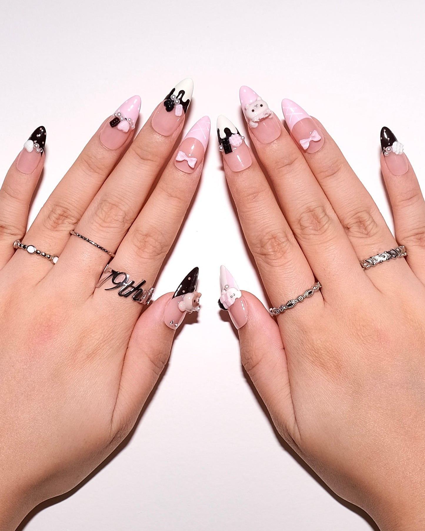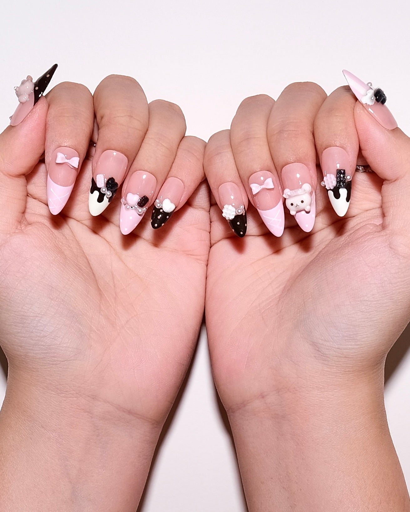 Regular price $34.00“Chocolate Teddy” is a sweet dessert-inspired press-on nail set featuring soft blush pink bases, chocolate drip accents, glossy cocoa tones, and adorable teddy bear charms. Finished with bows, pearls, and candy-like details, this set feels playful, cozy, and irresistibly cute—perfect for winter, Valentine’s season, or anyone who loves a soft kawaii vibe.