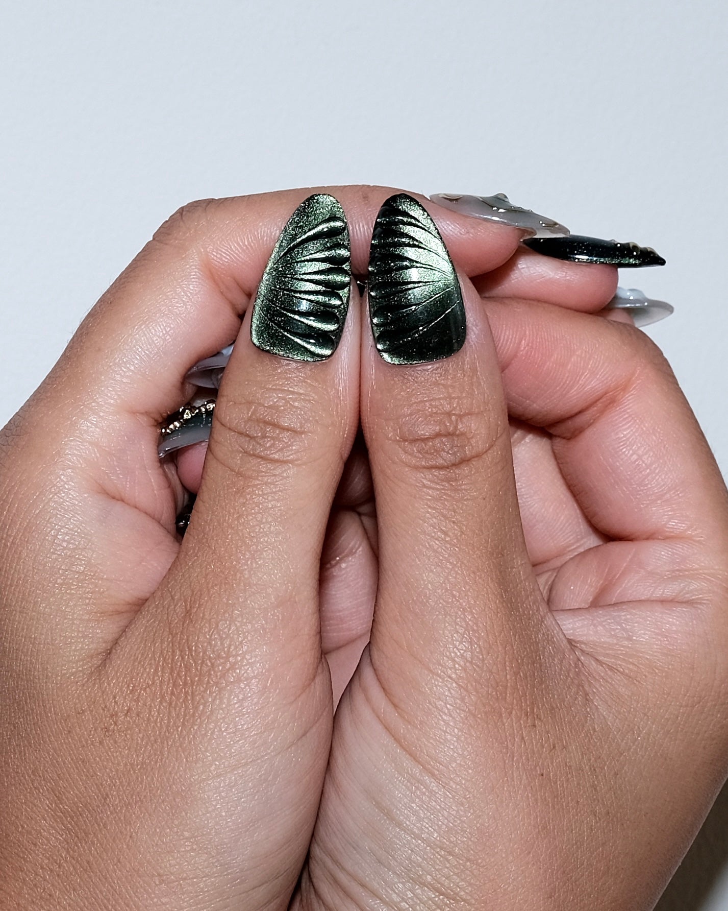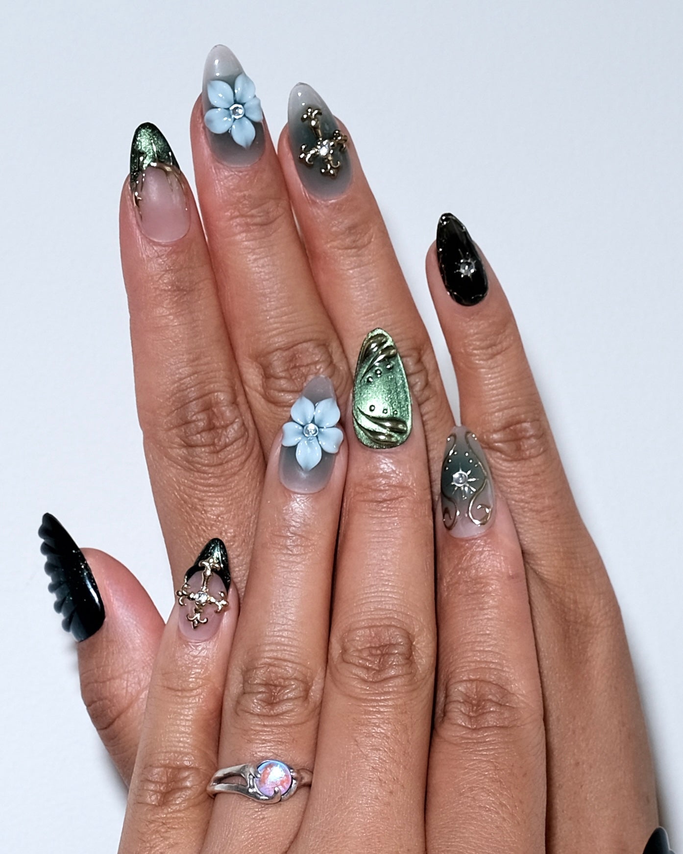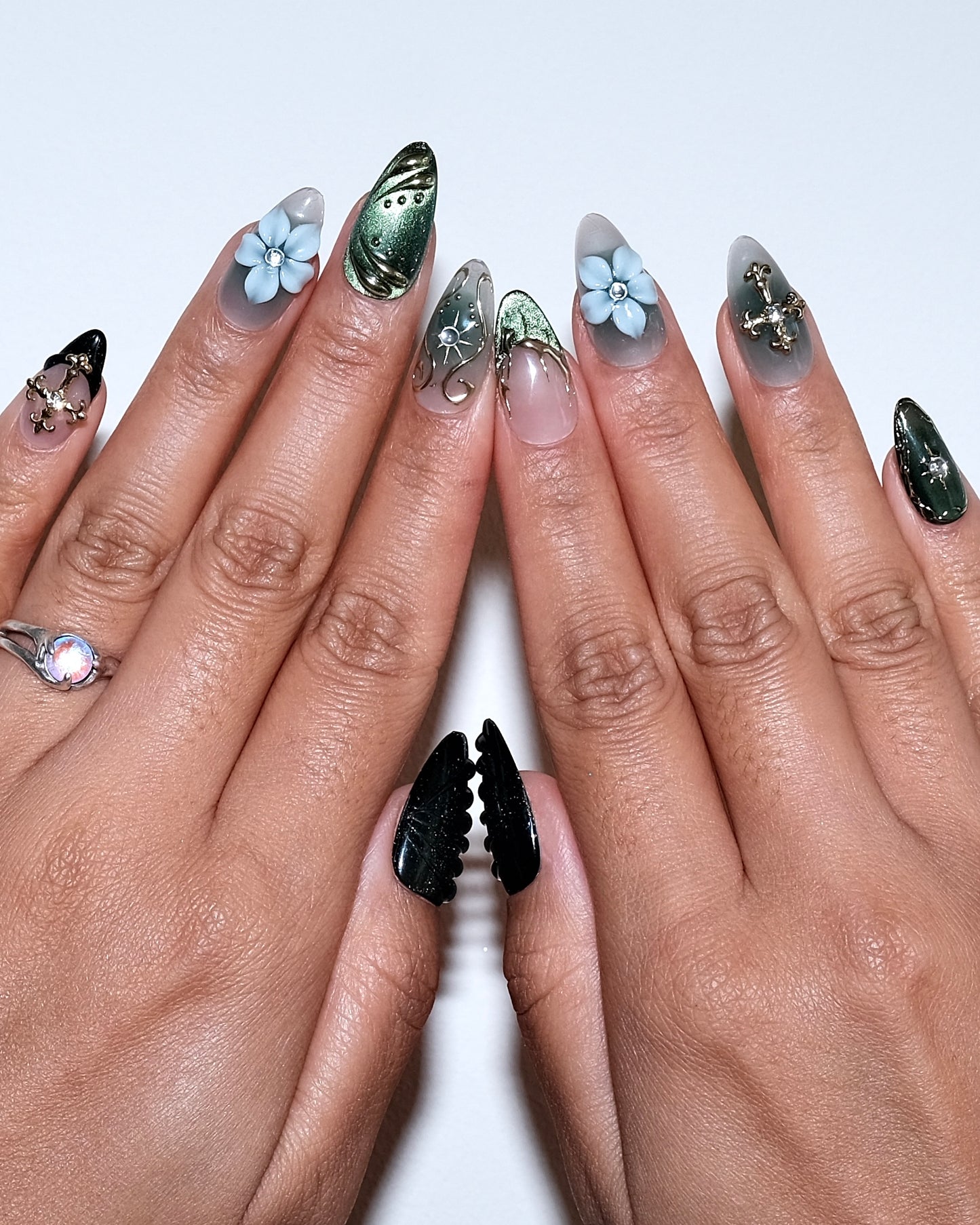 “Golden Forest” is a handmade press-on nail set in deep emerald tones, adorned with gold accents, crystal details, and 3D florals for an elegant fall-winter look.